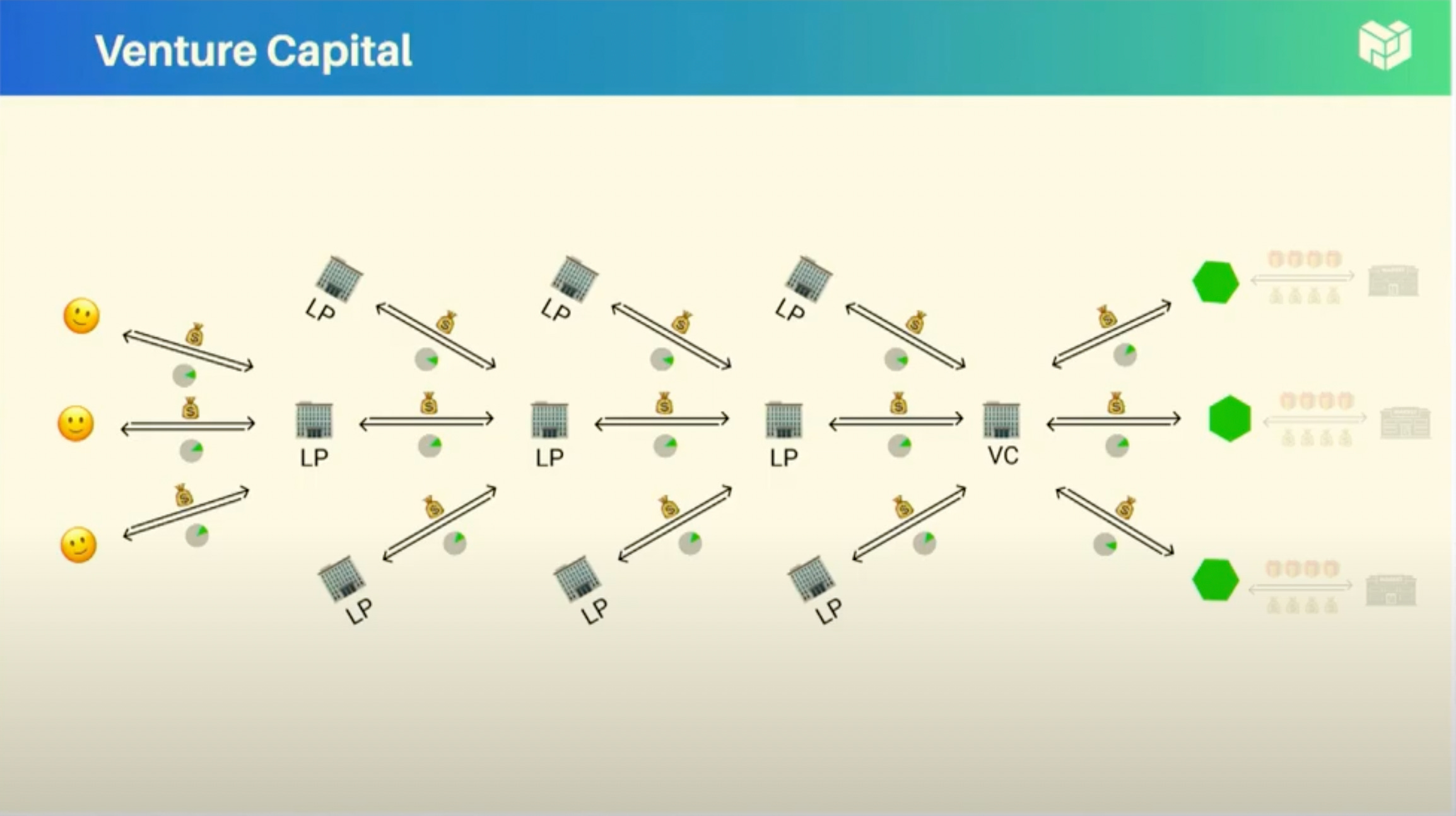 Juan’s talk explores why the venture capital (VC) model has worked so well well1. One reason is that the VCs who make the actual investment into a company tend to be close to some aspect (technical, social, etc.) of the projects that they fund. The VCs exchange stock certificates for cash with the startups, and then the VCs pass the stock certificates onto their own investors who then have their own investors, etc.. It is non-obvious that more steps in a network is a good thing: why would all these intermediate steps between the company and the original sources of the capital make sense?