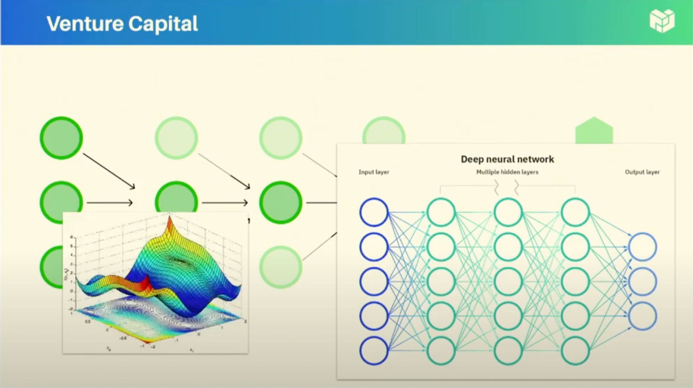 There is a topological argument of why this VC structure is powerful. Juan points out that this looks a lot like the composable learning units inside a deep neural network. Deep nets excel at learning complex solution surfaces at multiple scales (ie, broad trends vs tiny details), which Juan further illustrates in the slide below.