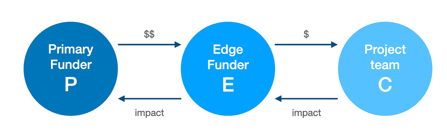 Let’s think through the simplest example. Assume you have a Project C, funded directly by an Edge Funder4, which distributes funds from Primary Funder P. To make this example tangible, let’s assume C is a bioengineering research effort toward a scalable carbon capture approach. For Project C, the core research risk is harnessing a previously difficult-to-engineer organism, and if the risk is overcome, there is a highly fundable larger project (or company) to be built. The interactions look like this: